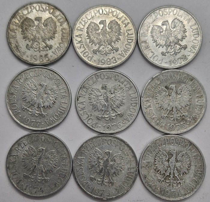 W zestawie 9 monet o nominale 50 gorszy z Polskiej Rzeczpospolitej Ludowej z rocznikami: