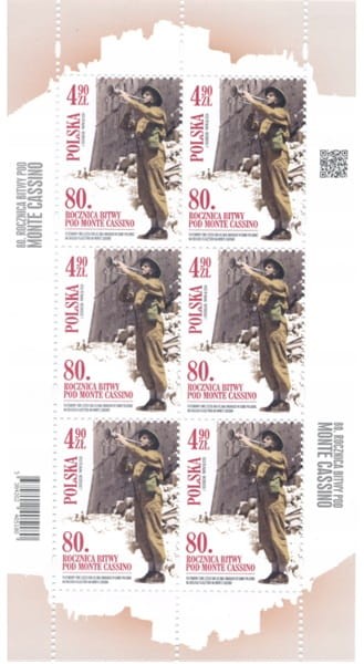 Arkusz 80. rocznica bitwy pod Monte Cassino 2024 r. - arkusz znaczków kolekcjonerskich o ograniczonym nakładzie pojedynczego znaczka 125 000 sztuk, emitent Poczta Polska, projektant Jarosław Ochendzan, stan zachowania nowy